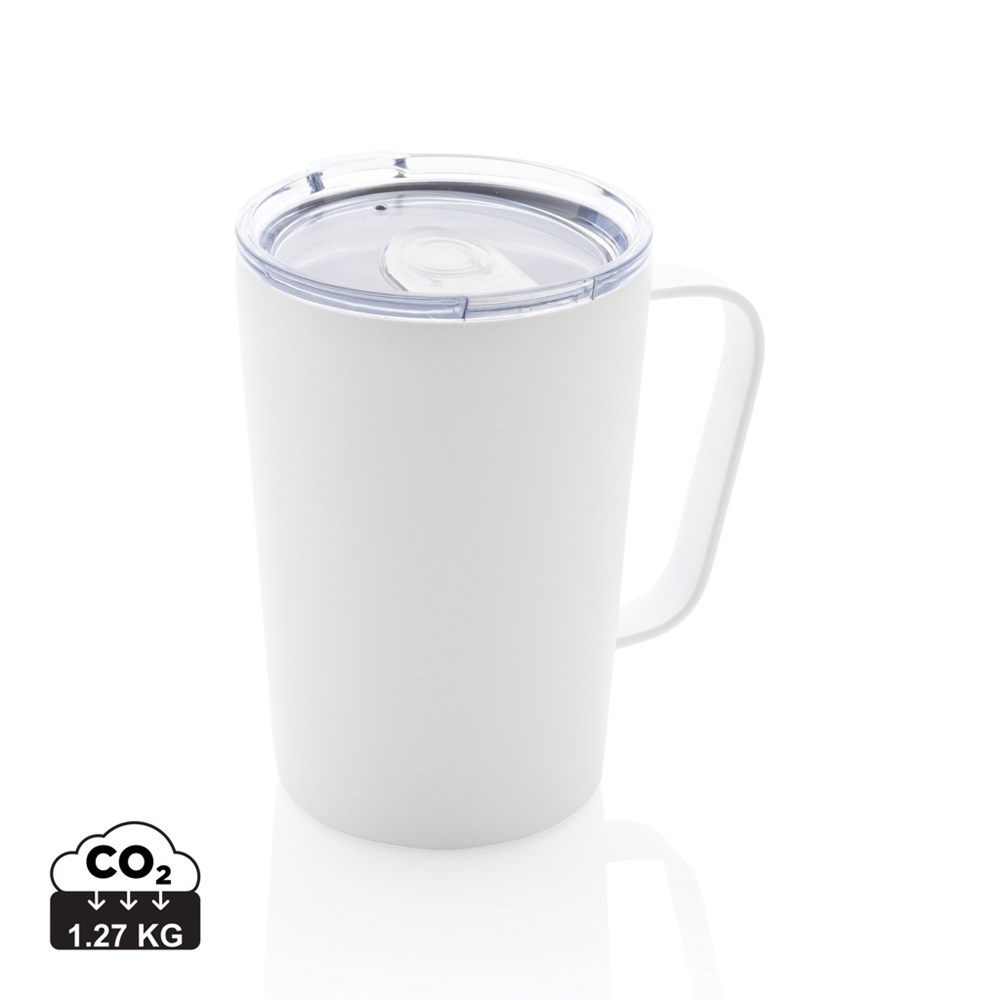 This RCS Recycled stainless steel modern mug features a spill-resistant lid that slides open smoothly to provide the perfect pour. This mug is made with double wall vacuum recycled stainless steel to keep beverages warm for up to 3 hours or cold for up to 6 hours longer. Made with RCS (Recycled Claim Standard) certified recycled materials. RCS certification ensures a completely certified supply chain of the recycled materials. Total recycled content: 88% based on total item weight. BPA free. Capacity 420ml. Including FSC®-certified kraft packaging.