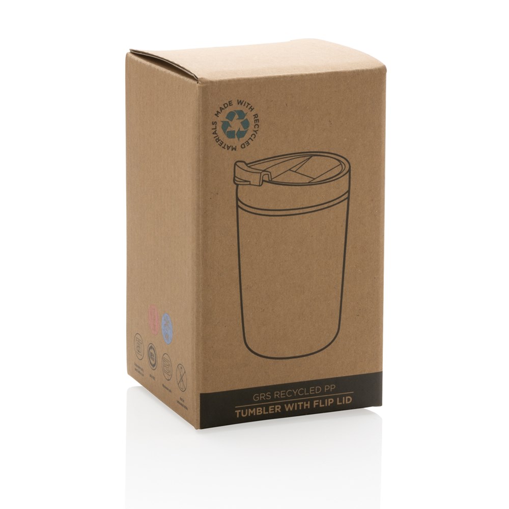 This tumbler is made entirely with GRS certified recycled PP. GRS certification ensures a completely certified supply chain of the recycled materials. The tumbler features a flip lid for convenient sipping on the go. Total recycled content: 35% based on total item weight. Handwash is recommended. BPA free. Capacity 300ml. An FSC®-certified kraft box is included.