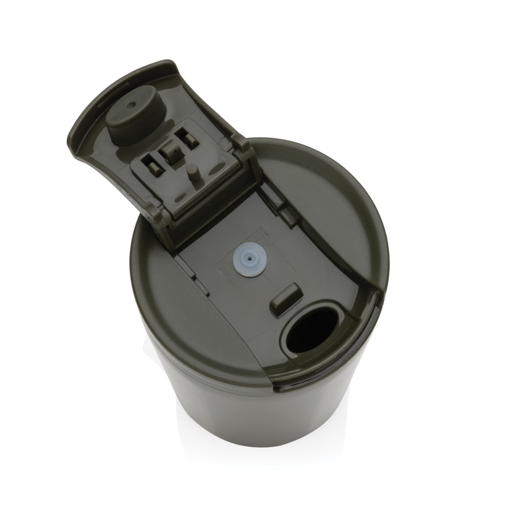 This double wall vacuum leakproof lock mug is the perfect size for your beverage. It's leakproof sealed flip lid is designed for easy open/close and on-the-go use. Vacuum insulation keeps beverages hot for up to 5 hours and cold for up to 15 hours. Made with RCS (Recycled Claim Standard) certified recycled materials. RCS certification ensures a completely certified supply chain of the recycled materials. Total recycled content: 80% based on total item weight. Capacity 300ml. BPA free and hand wash only.