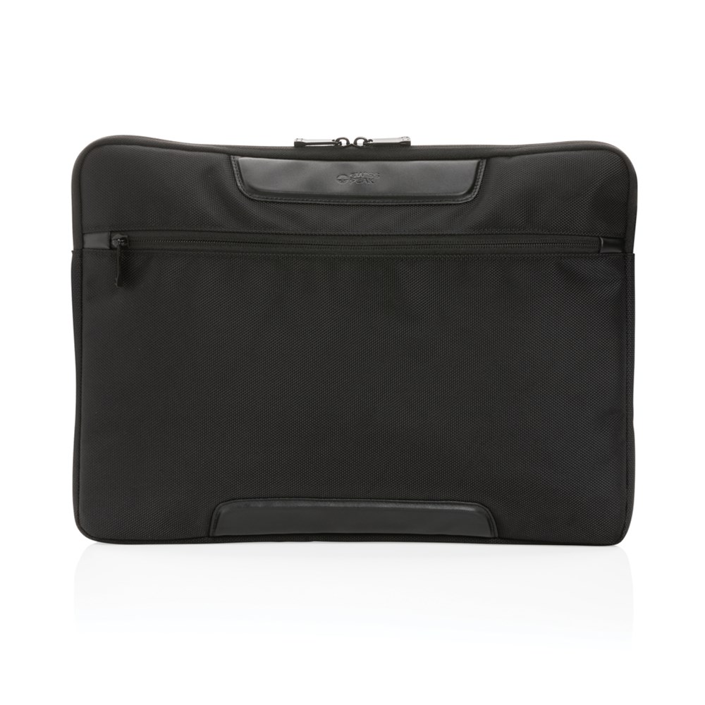 This sleek Swiss Peak AWARE™ RPET Voyager 15.6" laptop sleeve is the ideal accessory for bringing your laptop to work in style. Made with durable recycled 1680D recycled polyester and rich PU details. Features convenient front zipper pocket. The exterior is made with 1680D polyester and PU details, the lining is made with 150D recycled polyester. With AWARE™ tracer that validates the genuine use of recycled materials. Each bag has reused 16.38 0.5L PET bottles. 2% of proceeds of each product sold containing AWARE™ will be donated to Water.org.