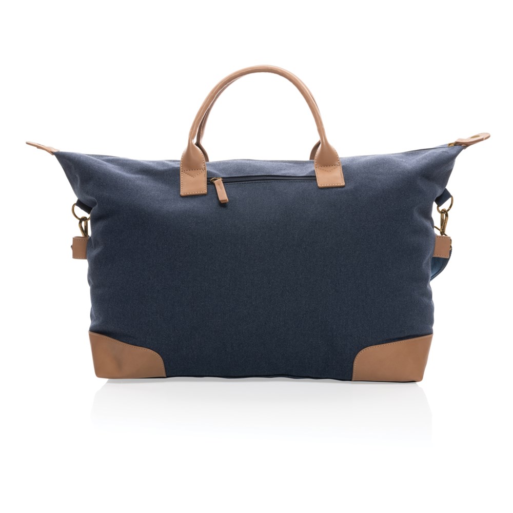 Plan your perfect getaway with this large 16oz. recycled canvas weekend bag. The bag features one big roomy compartment with front pocket and PU handles. The bottom features four brass studs to keep your bag clean when placed on the floor. 2% of proceeds of each Impact product sold will be donated to Water.org. Composition 60% recycled cotton and 40% recycled polyester. Lining in 150D recycled polyester.