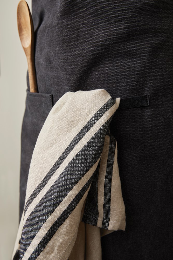 Apron made from 87% verified recycled material. This stylish apron is a practical kitchen accessory with a wonderful design. The apron has a pocket on the front and a loop for hanging utensils or kitchen towels, so you have everything to hand when you're in the middle of cooking. The apron has a soft and adjustable neck strap for increased comfort. Made from GRS (Global Recycled Standard) certified recycled materials. GRS certification ensures a fully certified supply chain of the recycled materials. Total recycled content is based on total product weight. This product contain 87% recycled cotton/polyester.