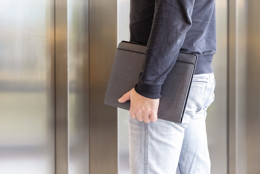The recycled leather portfolio adds a little bit of extra sophistication to your work. Keep your important documents, cards and notes together in this beautiful portfolio with black elastic binder. Inside the A4 portfolio you can find a lined 64 gm/2 recycled paper notepad containing 20 pages. Inside there’s 1 big sleeve pocket, 3 phone size pockets and 4 business card slots.