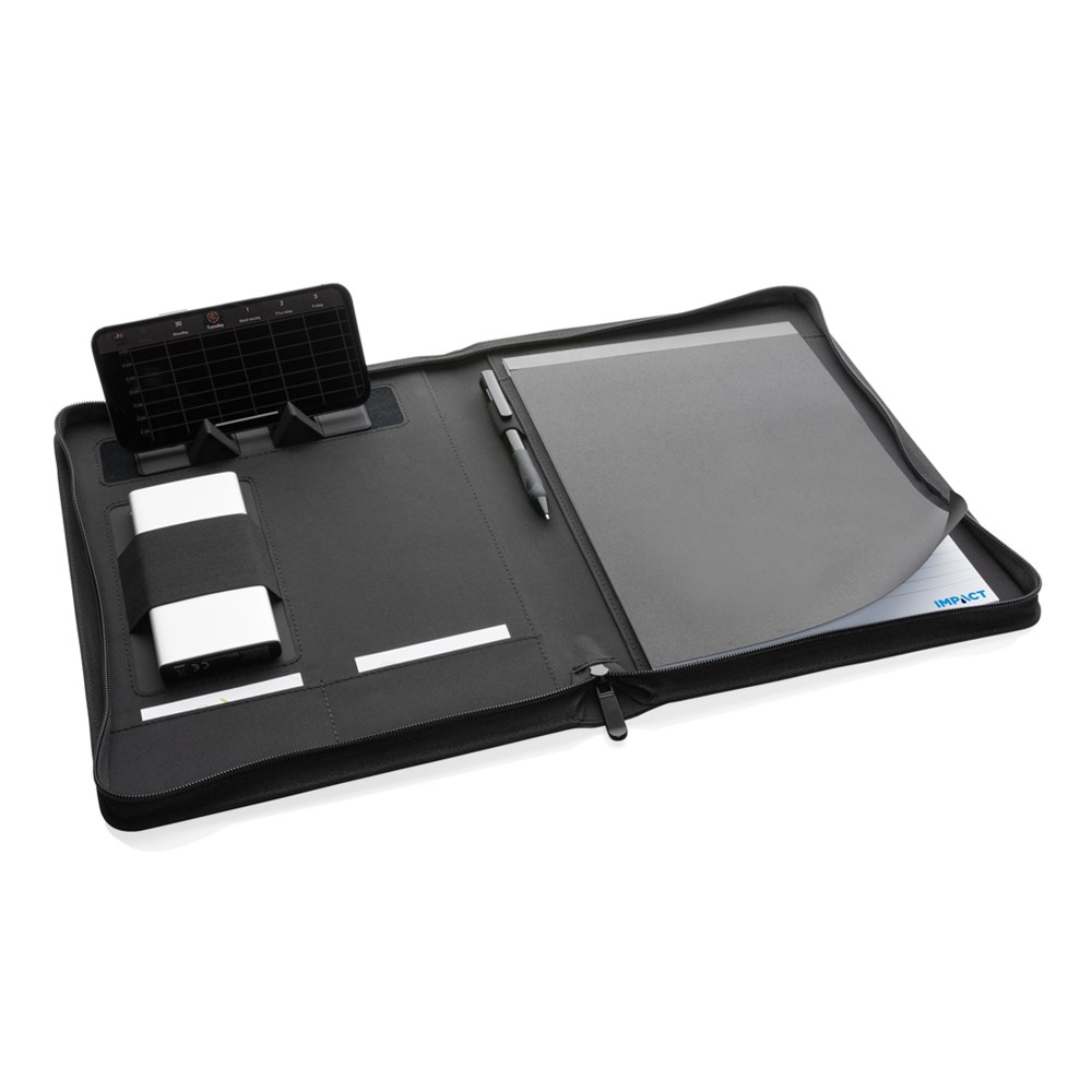 This A4 Impact AWARE™ deluxe 300D tech portfolio with zipper adds a little bit of extra sophistication to your work. Keep your important documents, cards and notes together. Inside the A4 portfolio you can find a lined 64 gm/2 recycled paper notepad containing 20 pages. Inside there is a 1 phone size pocket, a phone holder, pen loop and 2 business card slots. With AWARE™ tracer that validates the genuine use of recycled materials. Each portfolio has reused 8 0.5L PET bottles. 2% of proceeds of each Impact product sold will be donated to Water.org. PVC free.