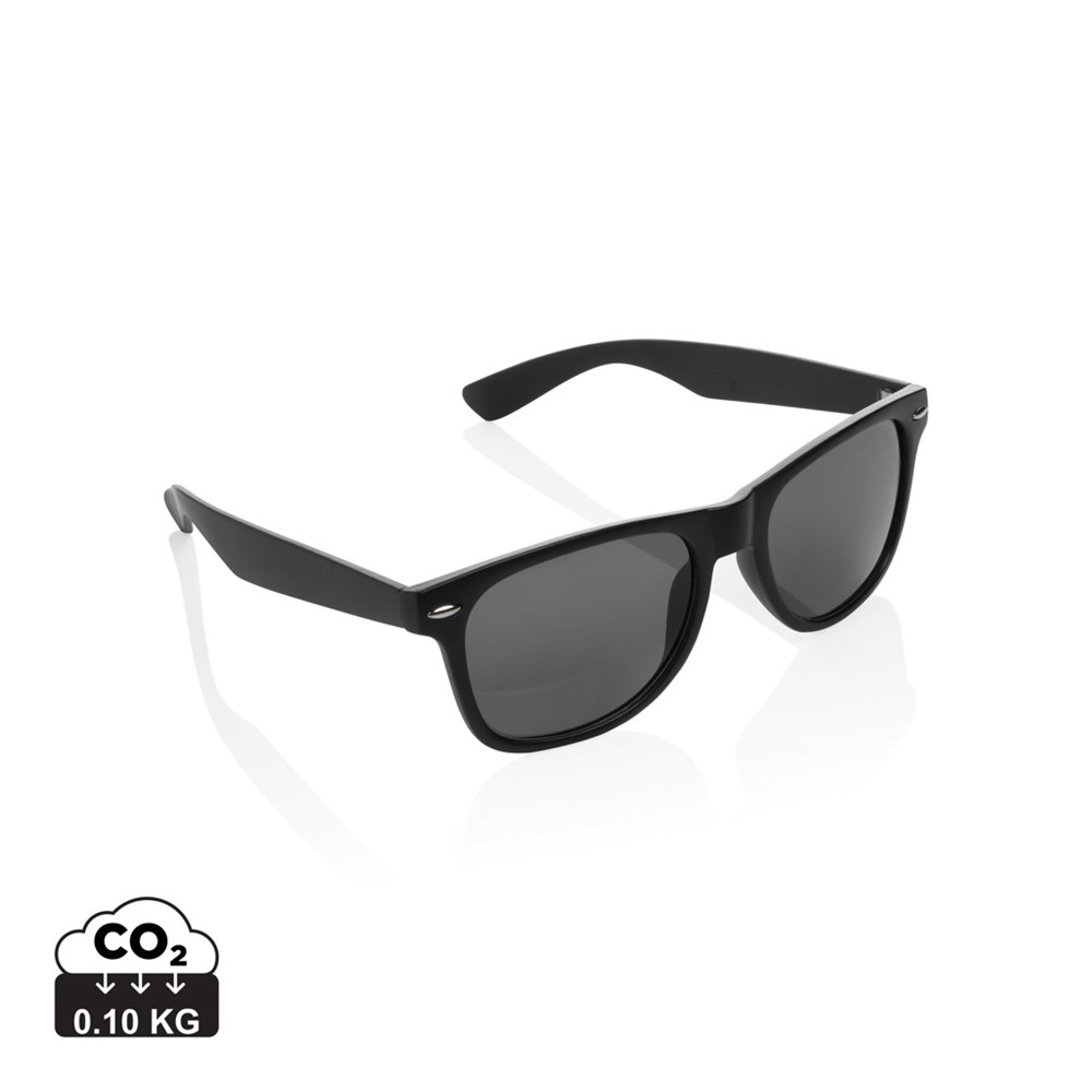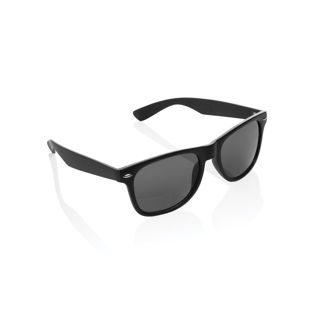 High quality sunglasses made with GRS certified recycled PC frame. Recycled content of frame is 100%. Total recycled content: 65% based on total item weight. GRS certification ensures a completely certified supply chain of the recycled materials. The lenses are smokey acrylic and conform to UV 400 and CAT 3. Packed in a kraft gift box.