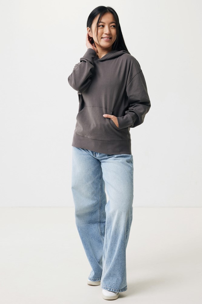This unisex relaxed fit hoodie has dropped shoulders and wider long sleeve, a double-layered hood and 2x2 rib bottom hem and cuffs. The trimmings in tonal colour and the small IQONIQ label in the side seam are nice finishing details. The composition is 100% cotton, of which 50% is recycled and 50% organic, in 340 G/M². No mix with plastics (such as polyester), so after life is recyclable into new cotton products. The inside is soft-brushed fleece for extra comfort. The use of genuine recycled & organic fabric materials and environmental impact claims are guaranteed, by using the AWARE™ disruptive physical tracer and blockchain technology. Every IQONIQ product has a unique QR label. By scanning this QR, you will gain access to a dedicated digital passport of the product. 2% of proceeds of each product sold will be donated to Water.org. Due to the nature of recycled yarns, impurities and colour variations may appear.