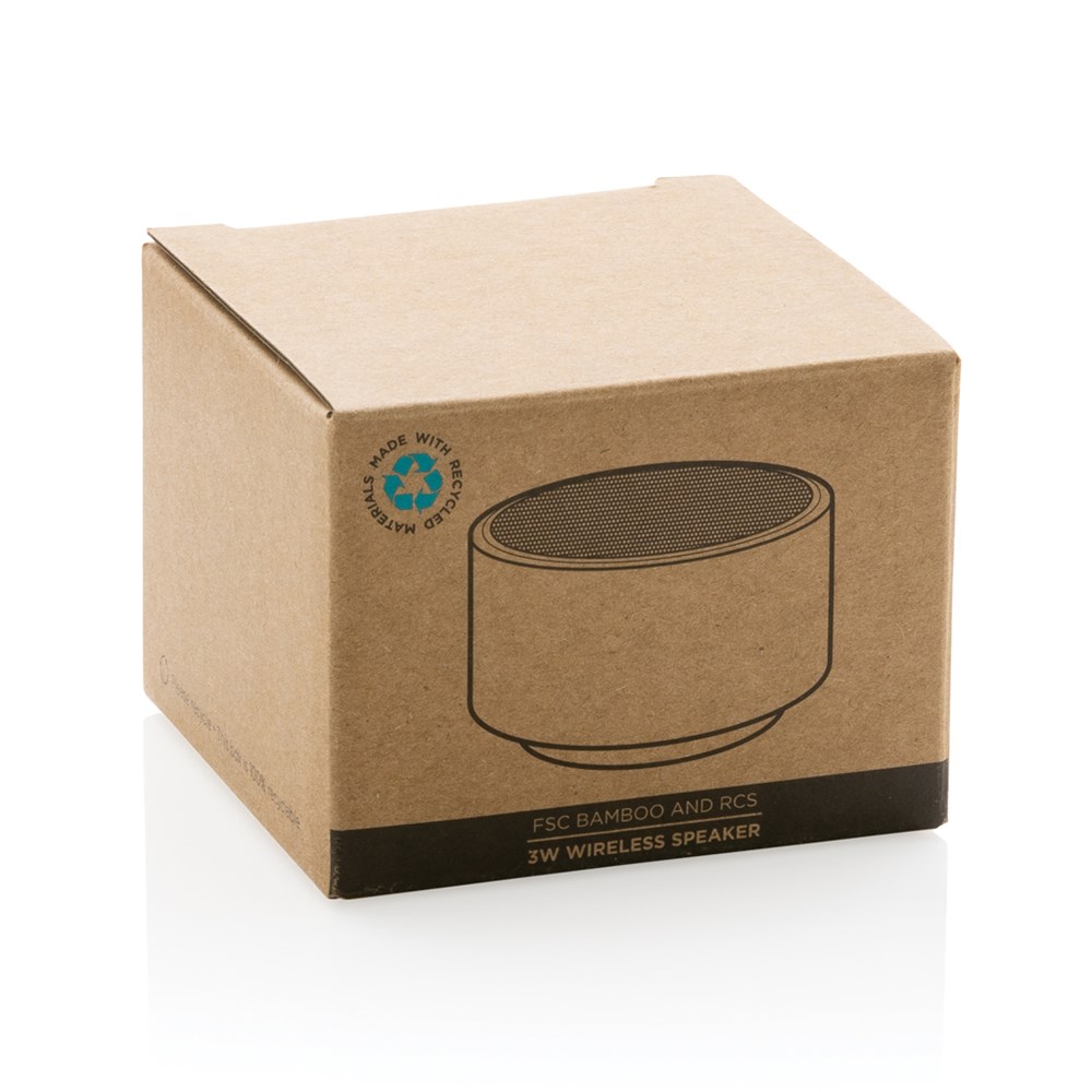 3W wireless speaker made with FSC® 100% bamboo casing and RCS (Recycled Claim Standard) certified recycled ABS. Total recycled content: 16% based on total item weight. RCS certification ensures a completely certified supply chain of the recycled materials. The speaker has an integrated light at the bottom. The speaker is equipped with a 300 mAh battery to ensure up to 3 hours of playing time and BT4.1 for smooth connection and clear sound. Connection range up to 10 metres. With mic to answer calls. Packed in FSC mix FSC® box. Including RCS certified recycled TPE charging cable. Item and accessories 100% PVC free.